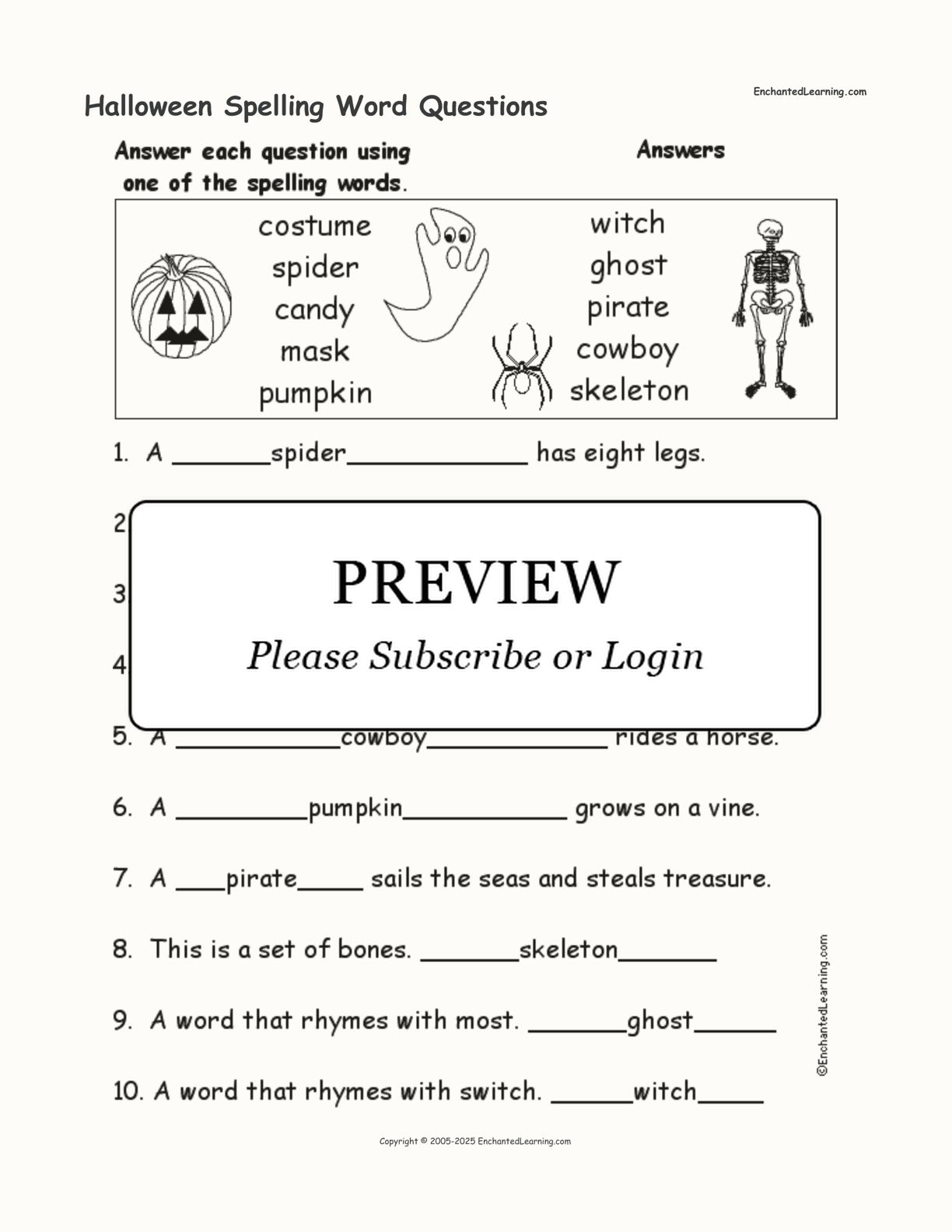 Use the list of Halloween spelling words to answer simple questions in this printable worksheet.