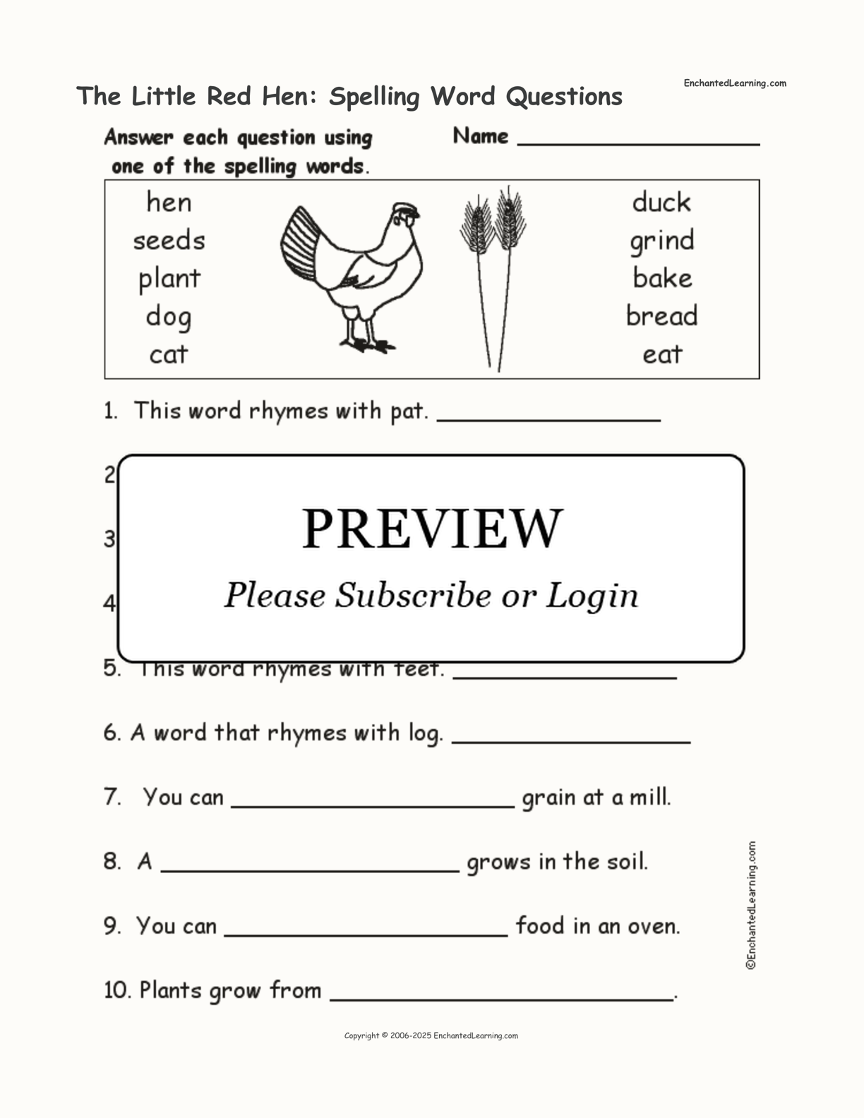 Use the list of ‘Little Red Hen’ spelling words to answer simple questions.