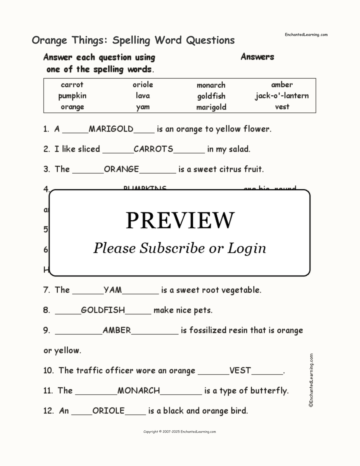 Words: carrot, pumpkin, orange, oriole, lava, yam, monarch, goldfish, marigold, amber, jack-o’-lantern, and vest.