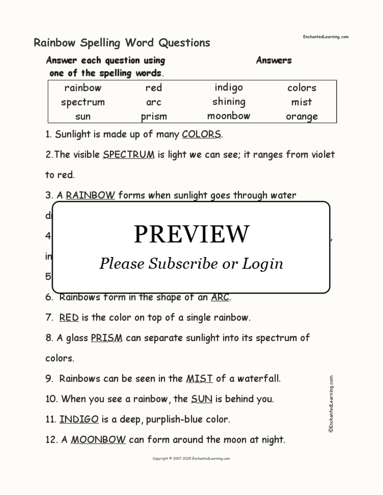 Use the list of rainbow spelling words to answer simple questions.