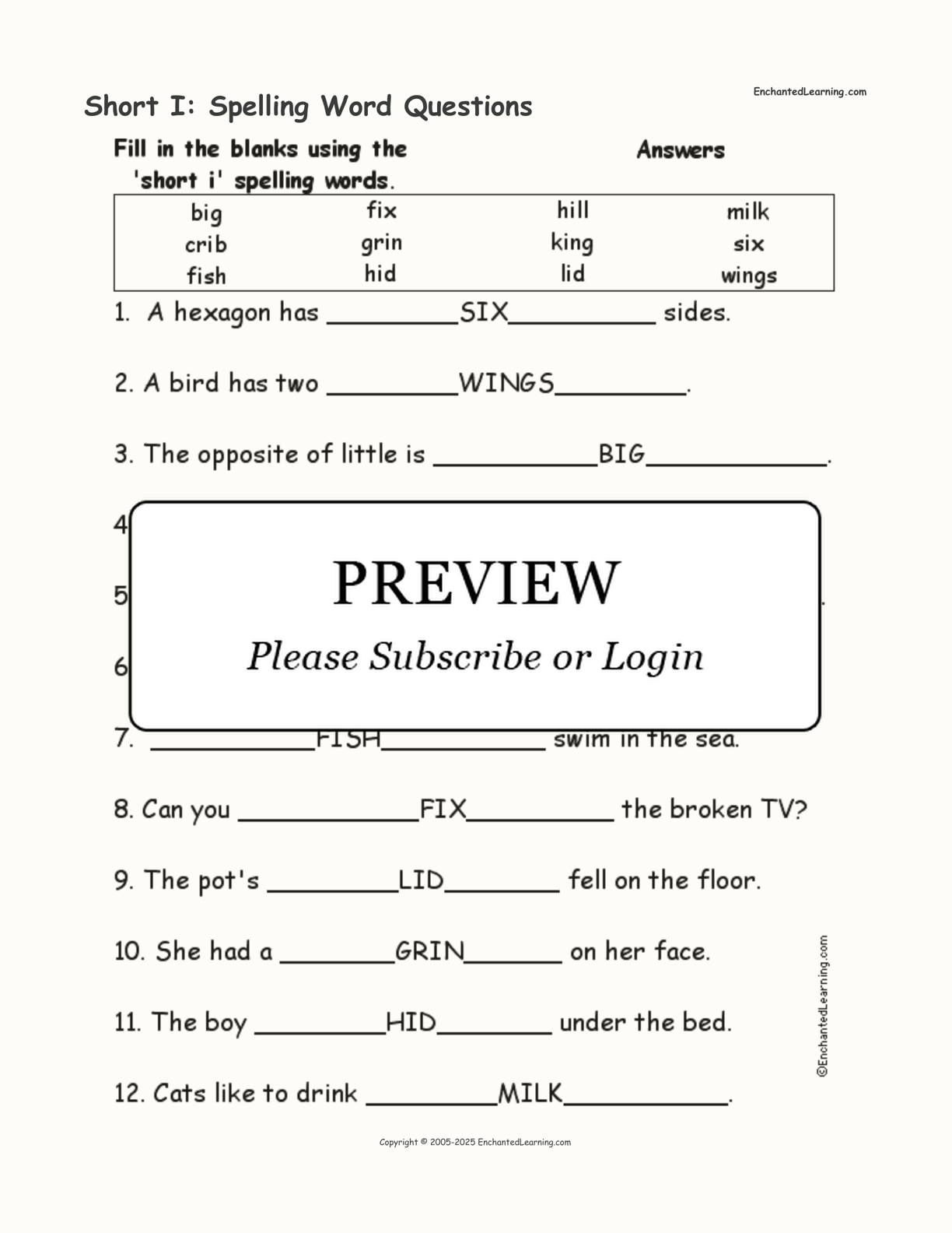 Use the list of ‘short i’ spelling words to answer simple questions.