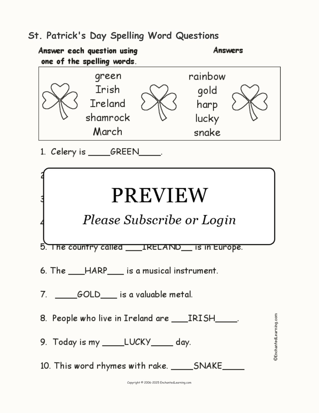 Answer each of the questions using one of the St. Patrick’s Day spelling words. This printable worksheet is for early readers.