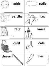 Unscramble Words Starting With Consonant Blends and Digraphs: Cl Unscramble the letters to make words starting with cl, and then color the picture of the word. The words are clock, cloud, clothes, clap, cliff, clown, clam, claw, clarinet, club. Or go to the answers. |
