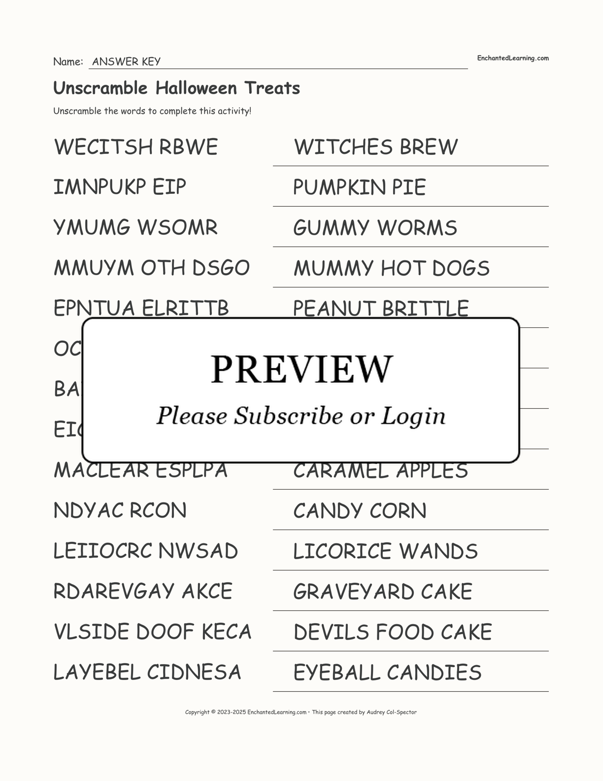 This is a printable worksheet of deliciously spooky Halloween treats, all scrambled. Try to unscramble them!