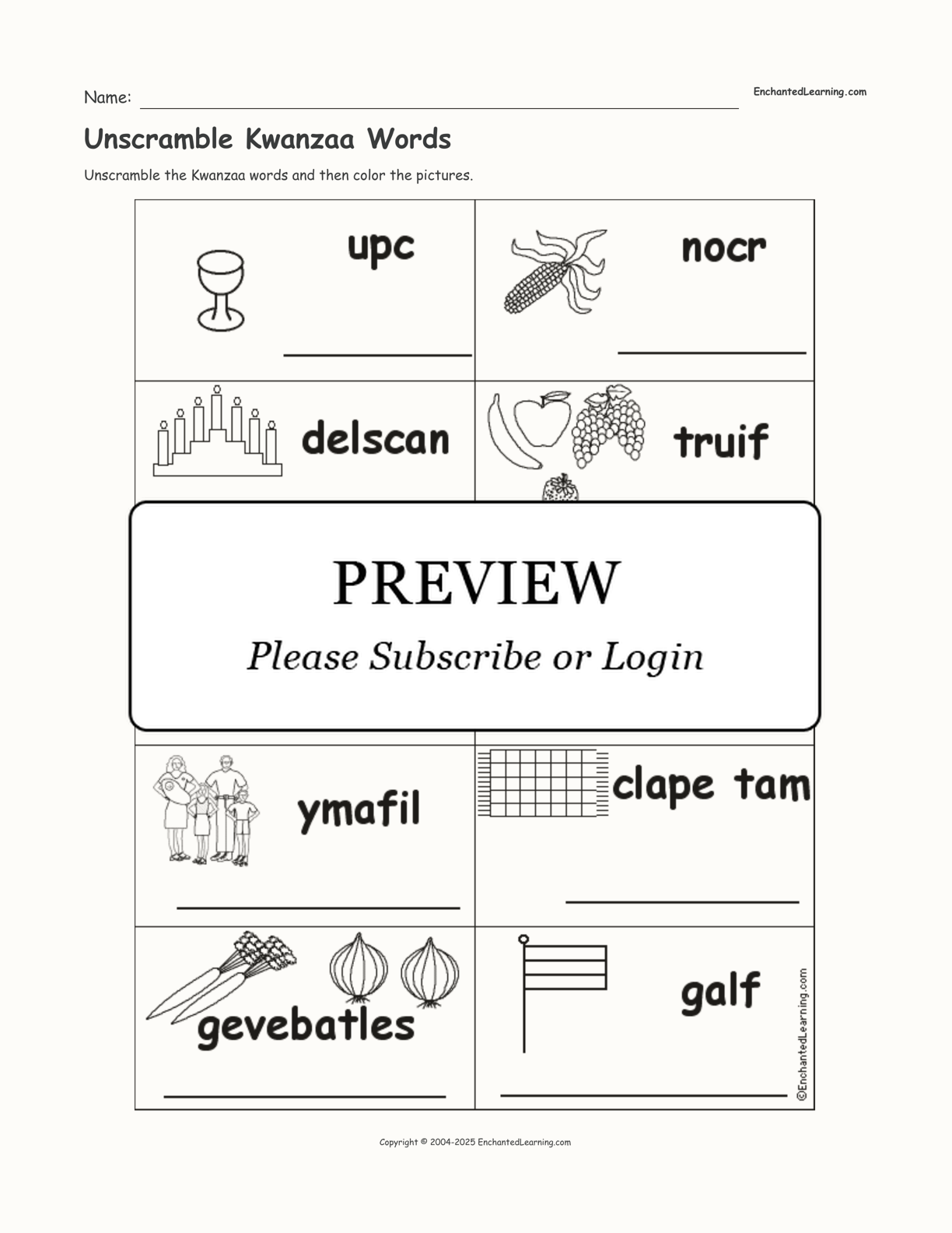 Unscramble the Kwanzaa words and then color the picture of the words.