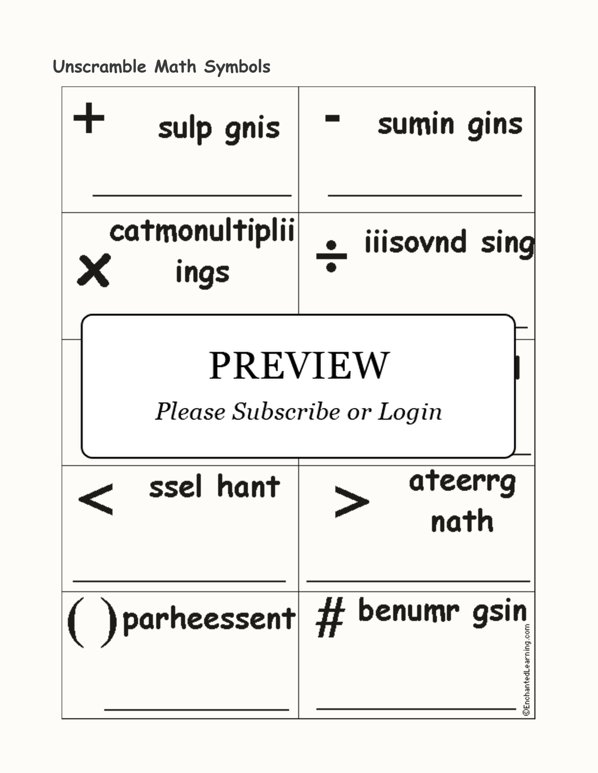 Unscramble Math Symbols: A printout about math marks for early readers.