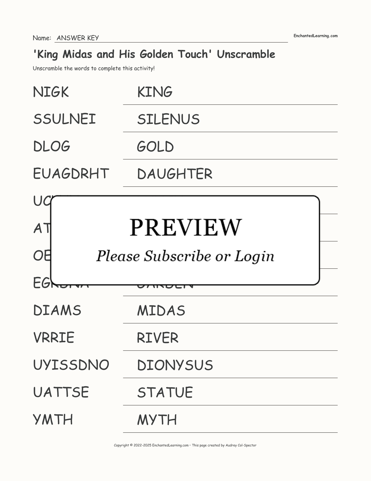 Solve the unscramble worksheet using words from the 'King Midas' myth.