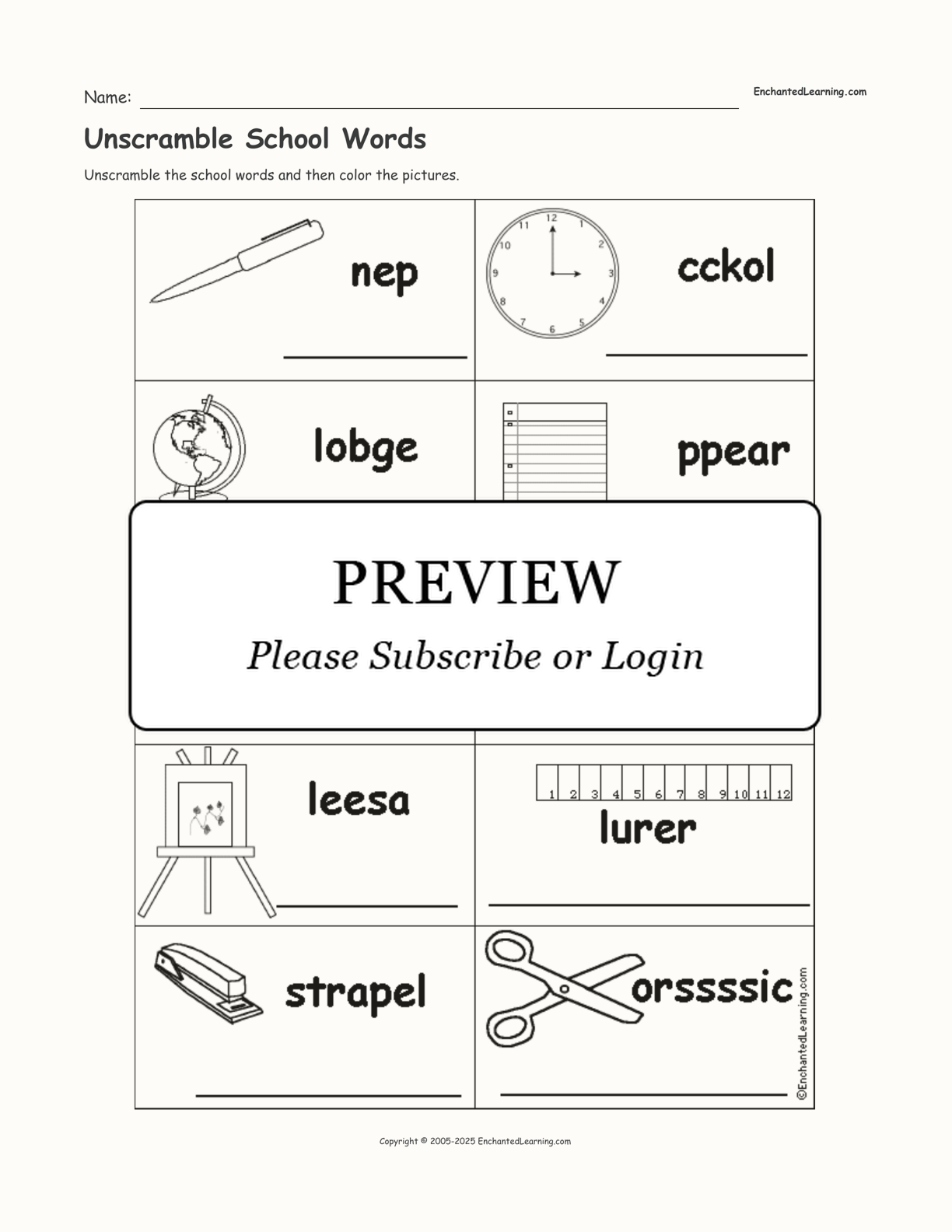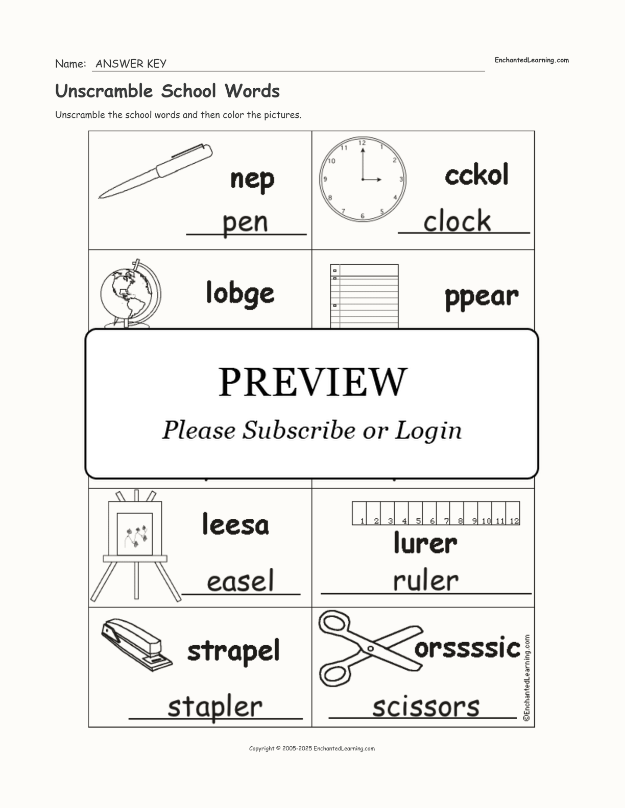 The words are: pen, clock, globe, paper, crayon, pencil, easel, ruler, stapler, and scissors.