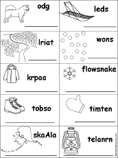 Unscramble Iditarod Words Unscramble the Iditarod words, and then color the pictures of the words. The words are dog, sled, trail, snow, parka, snowflake, boots, mitten, Alaska, lantern. |
