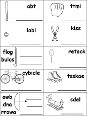 Unscramble Sports Words Unscramble the sports words, and then color the pictures of the words. The words are bat, mitt, ball, skis, golf clubs, racket, bow and arrow, skates, bicycle, sled. |