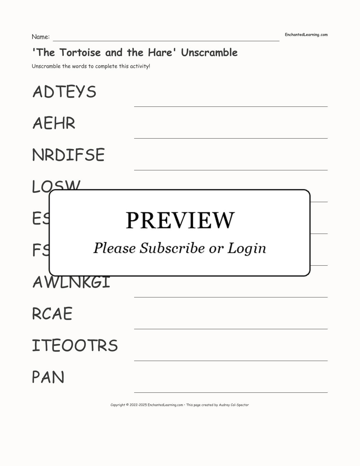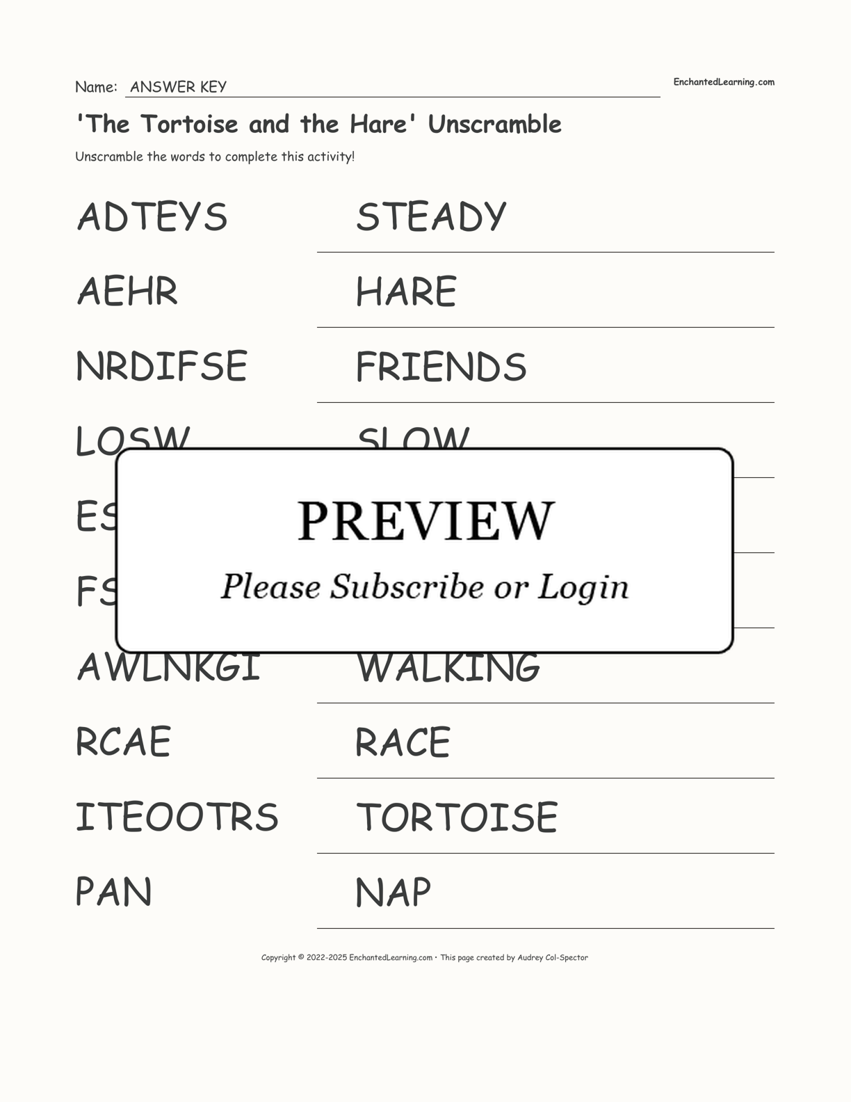 Solve the unscramble worksheet using words from 'The Tortoise and the Hare' Aesop's Tale.