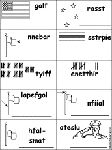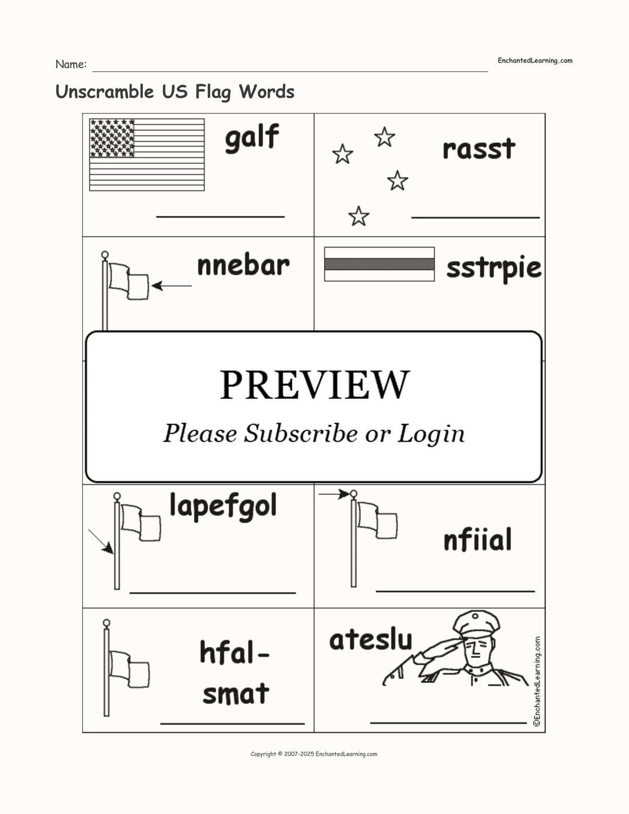 Unscramble the US Flag words, and then color the pictures of the words. The words are flag, stars, banner, stripes, fifty, thirteen, flagpole, finial, half-mast, salute.