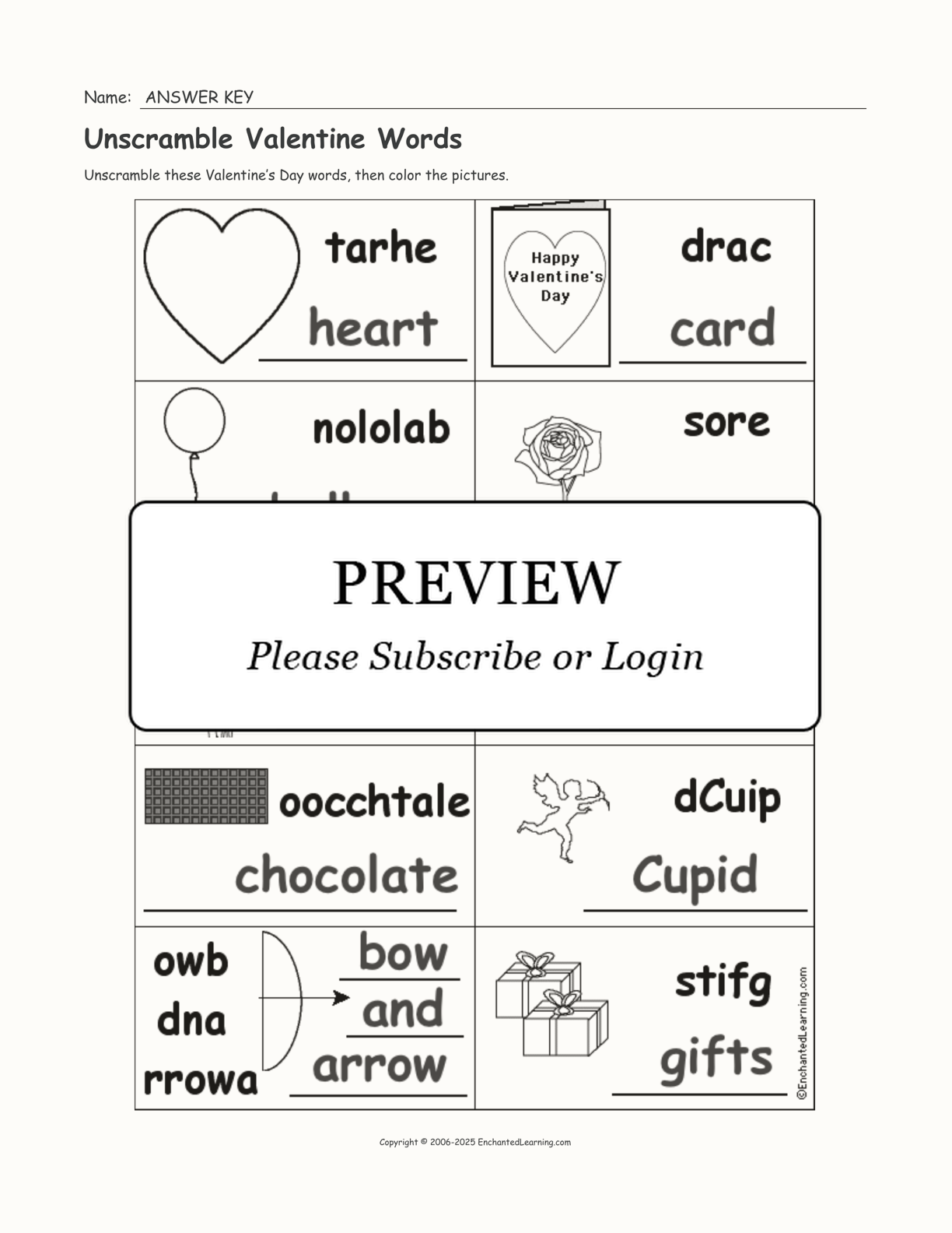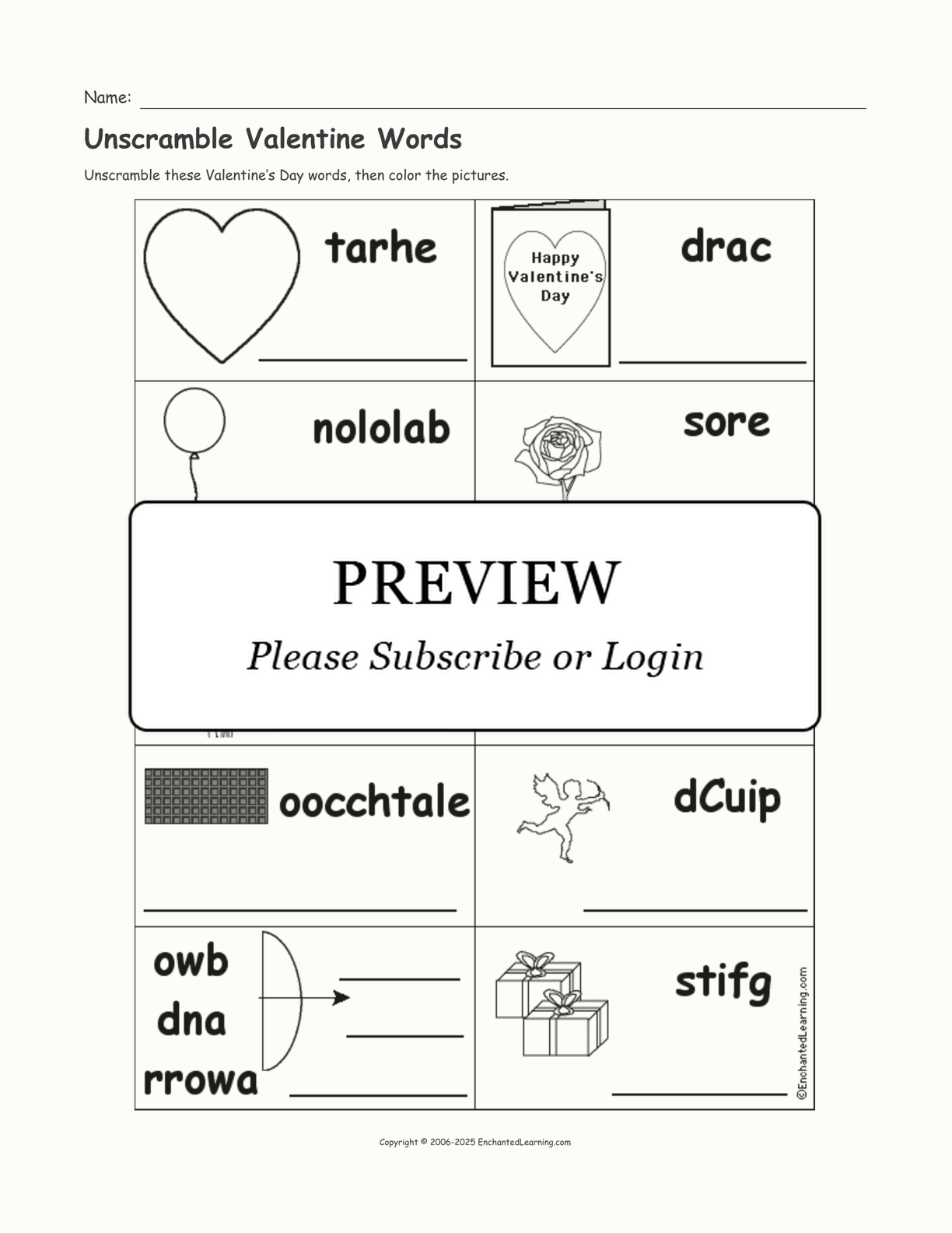 Unscramble these Valentine's Day words, then color the pictures. This printable worksheet is for early readers.