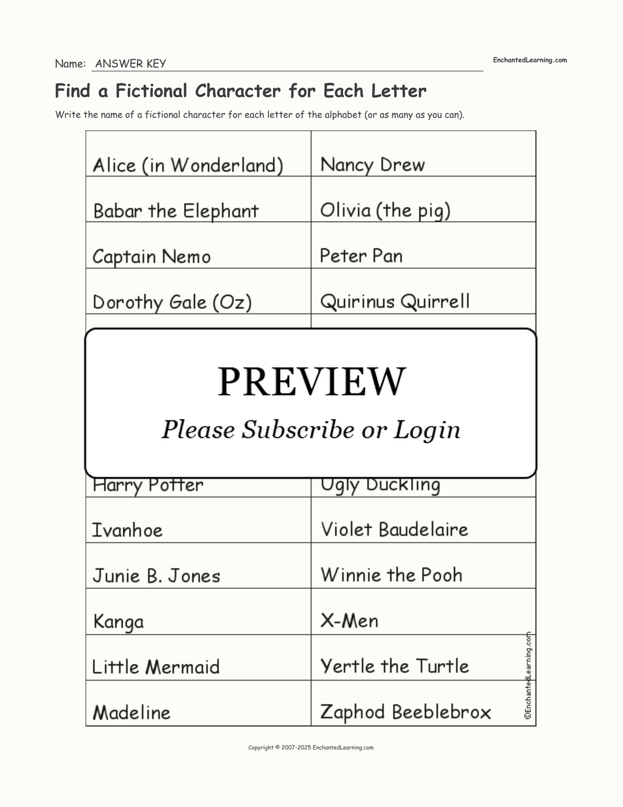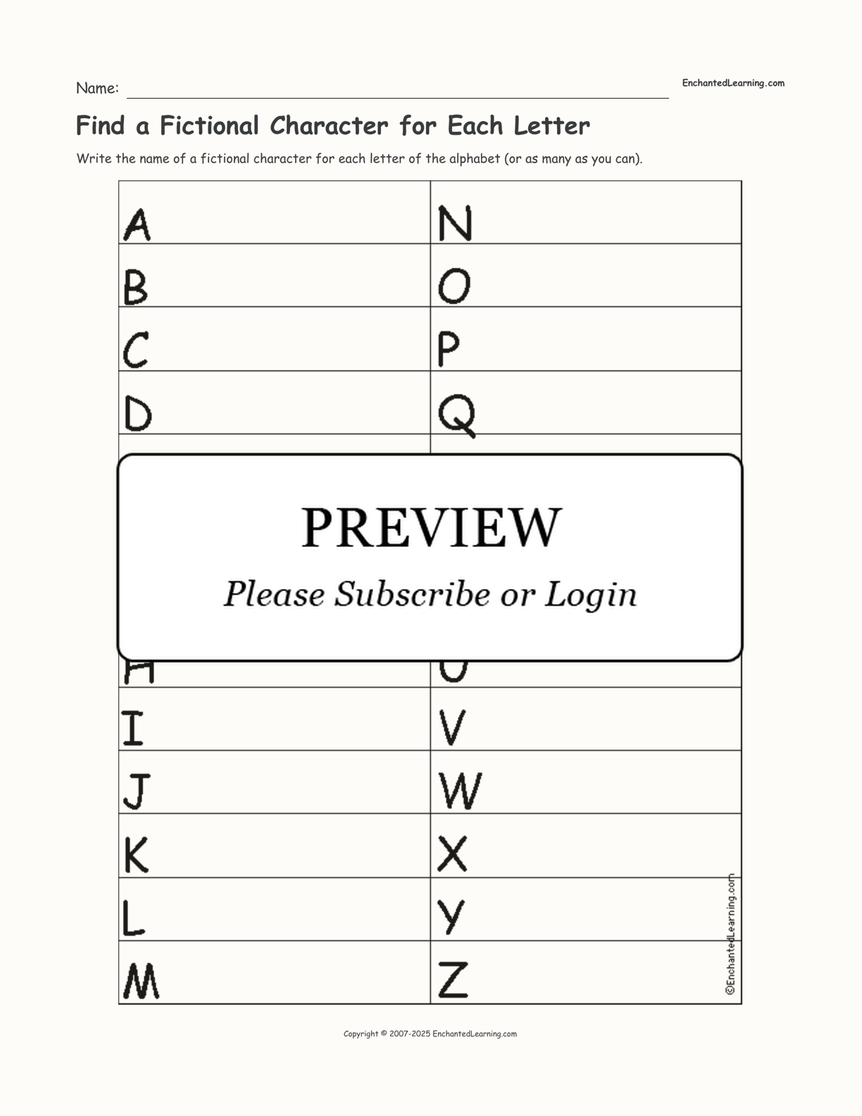 See if you can think of and write down the name of a fictional character for each letter of the alphabet.