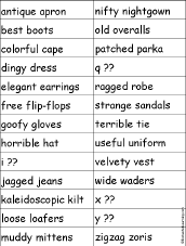 Find an Adjective plus Clothing Word for Each Letter See if you can think of and write down a phrase with an adjective and a clothing word for each letter of the alphabet (for example, "antique apron"). Or go to a sample answer page. |