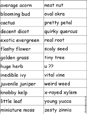 Find an Adjective plus Plant Word for Each Letter See if you can think of and write down a phrase with an adjective and a plant word for each letter of the alphabet (for example, "average acorn"). Or go to a sample answer page. |