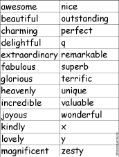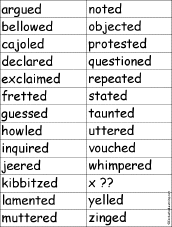 Find a Substitute for the Word "Said" for Each Letter See if you can think of and write down a substitute for "said" for each letter of the alphabet. Or go to a sample answer page. |