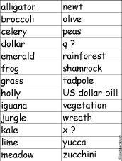 Find a Green Thing for Each Letter See if you can think of and write down a green thing for each letter of the alphabet. Or go to a sample answer page. |