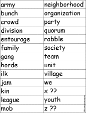 Find a Word for a Group of People for Each Letter See if you can think of and write down a word for a group of people that starts with each letter of the alphabet. Or go to a sample answer page. |