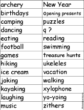 Find a Summer Word for Each Letter See if you can think of and write down a summer-related word for each letter of the alphabet. Or go to a sample answer page. |