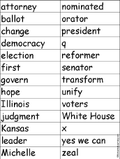Find a Barack Obama-Related Word for Each Letter See if you can think of and write down a word related to Barack Obama, the 44th President of the USA, for each letter of the alphabet. Or go to a sample answer page. |