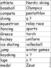 Olympic Games: Find an Olympics-Related Word for Each Letter See if you can think of and write down an Olympic Games-related word that starts with each letter of the alphabet. Or go to a sample answer page. |