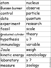 Find a Science-Related Word for Each Letter See if you can think of and write down a science word for each letter of the alphabet. Find a science-related words for as many letters as you can. Or go to a sample answer page. |