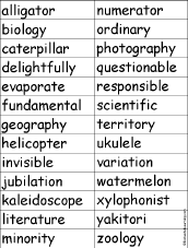 Find a Five-Syllable Word for Each Letter See if you can think of and write down a five-syllable word for each letter of the alphabet. Or go to a sample answer page. |
