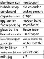Find Things We Throw Away for Each Letter See if you can think of and write down something we throw away for each letter of the alphabet. |