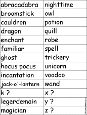 Find a Witch or Magic-Related Word for Each Letter See if you can think of and write down a witch or magic-related word for each letter of the alphabet. Or go to a sample answer page. |