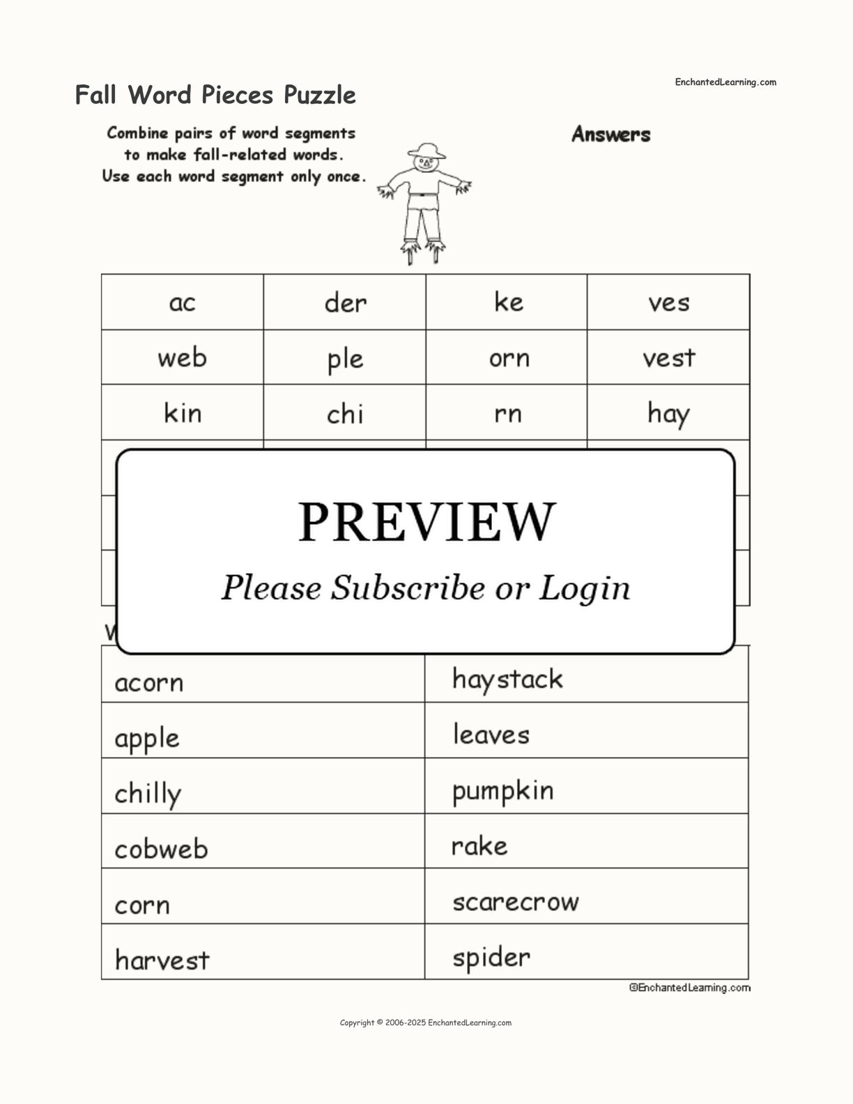 ‘Fall Word Pieces Puzzle’. In this printable worksheet, make Autumn/Fall-related words from word segments: acorn, apple, chilly, cobweb, corn, harvest, haystack, leaves, pumpkin, rake, scarecrow, and spider.