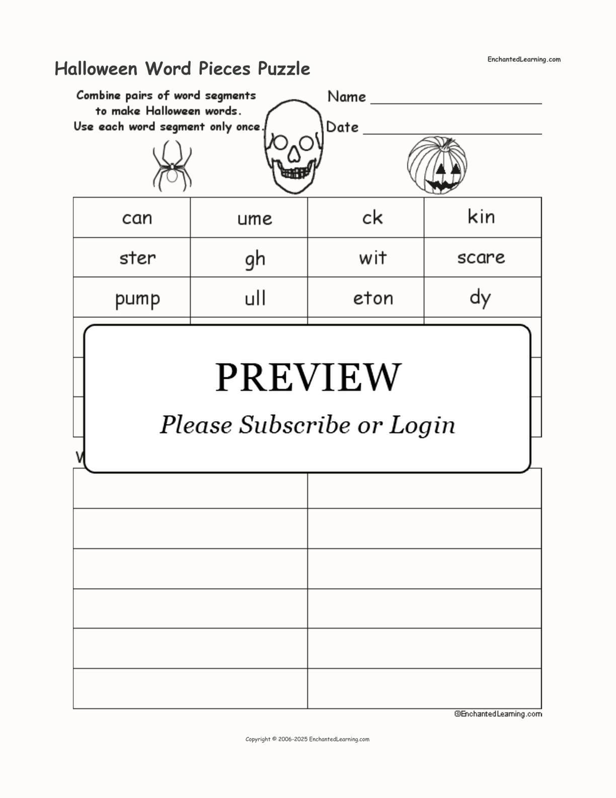 Combine pairs of word segments to make Halloween words from word segments – combine them like puzzle pieces, for a festive holiday! Use each word segment only once.