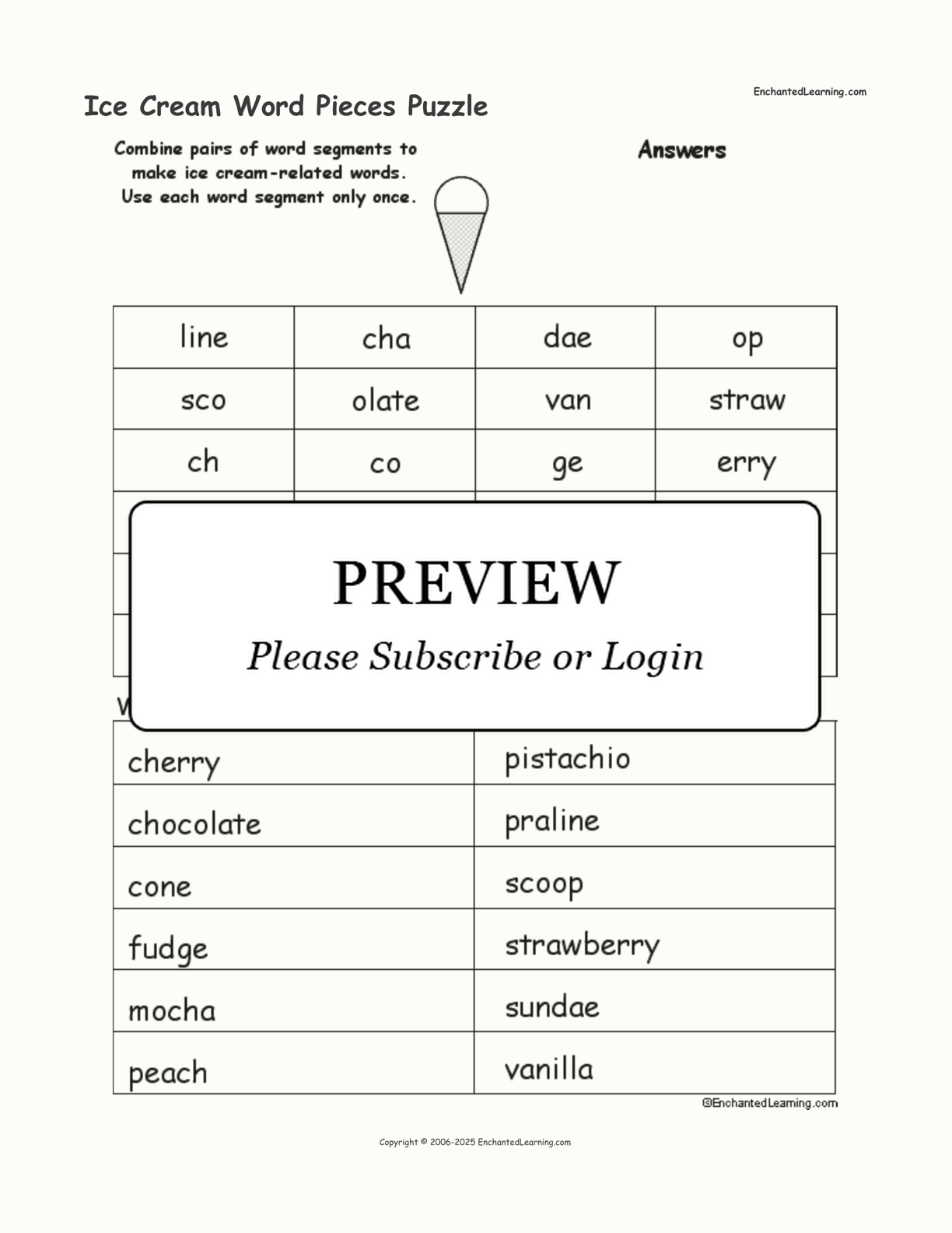 In this word pieces puzzle, combine pairs of word segments to make ice cream-related spelling words.