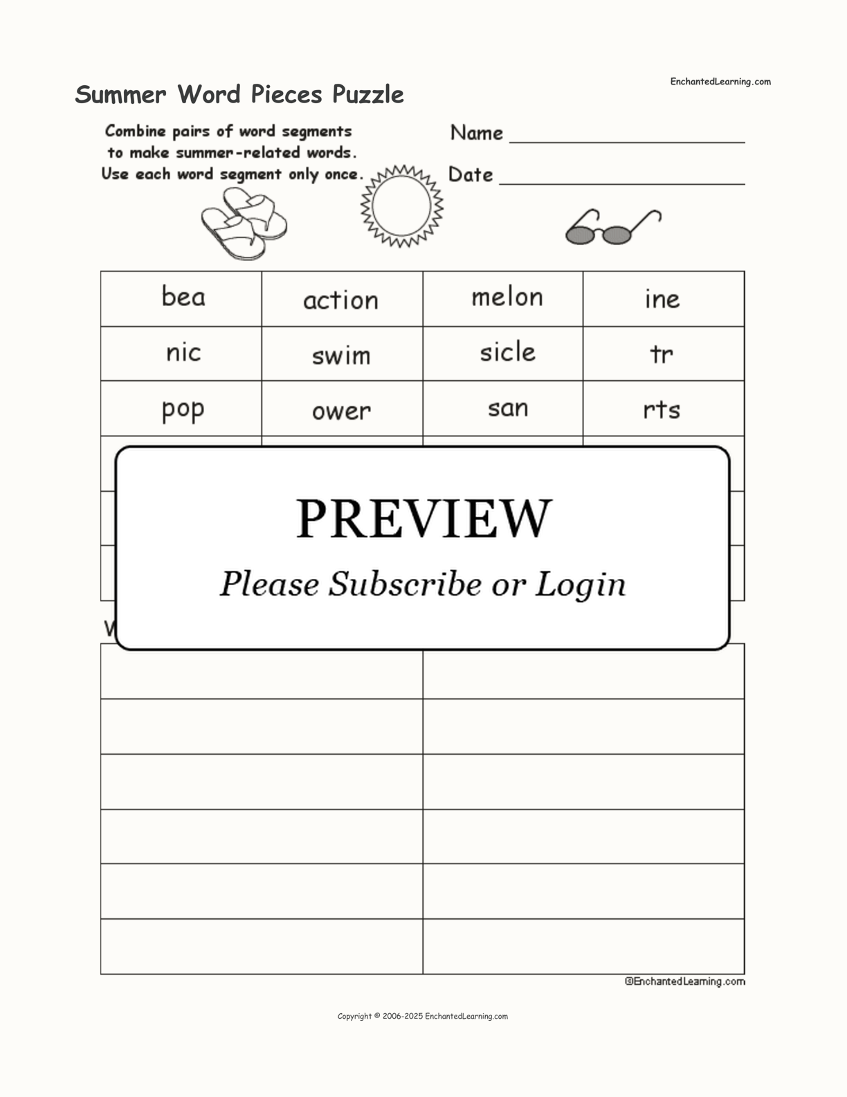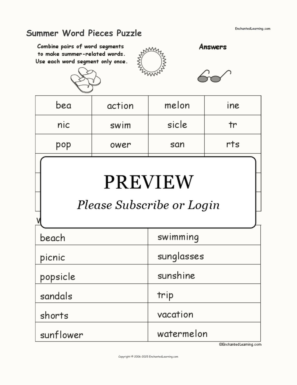 In this puzzle, combine pairs of word segments to make summer-related spelling words.
