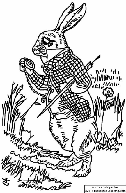 A coloring page printout and an interactive online coloring page of the White Rabbit looking at his watch. Based on an illustration by John Tenniel from the first edition of Alice's Adventures in Wonderland, by Lewis Carroll.