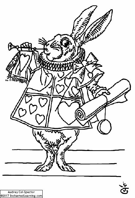 A coloring page printout and an interactive online coloring page of the White Rabbit blowing a trumpet. Based on an 1865 drawing by John Tenniel from the first edition of Alice's Adventures in Wonderland, by Lewis Carroll.