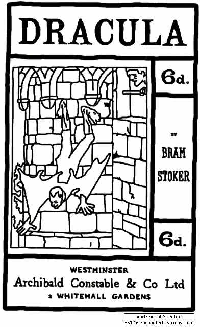 A coloring page printout and an interactive online coloring page from a 1901 illustration of Bram Stoker's Transylvanian vampire, Count Dracula.