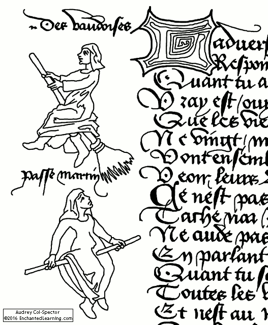 This picture of two witches is based on a drawing by Peronet Lamy in the illuminated manuscript Le Champion des Dames, which was written by Martin Le Franc in 1451. The witches here probably weren’t playing quidditch!