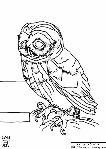 This is a coloring page of the painting "The Little Owl", by Albrecht Dürer.