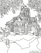 A coloring page based on The Church in Auvers-sur-Oise, View from the Chevet, painted in 1890 by van Gogh.
