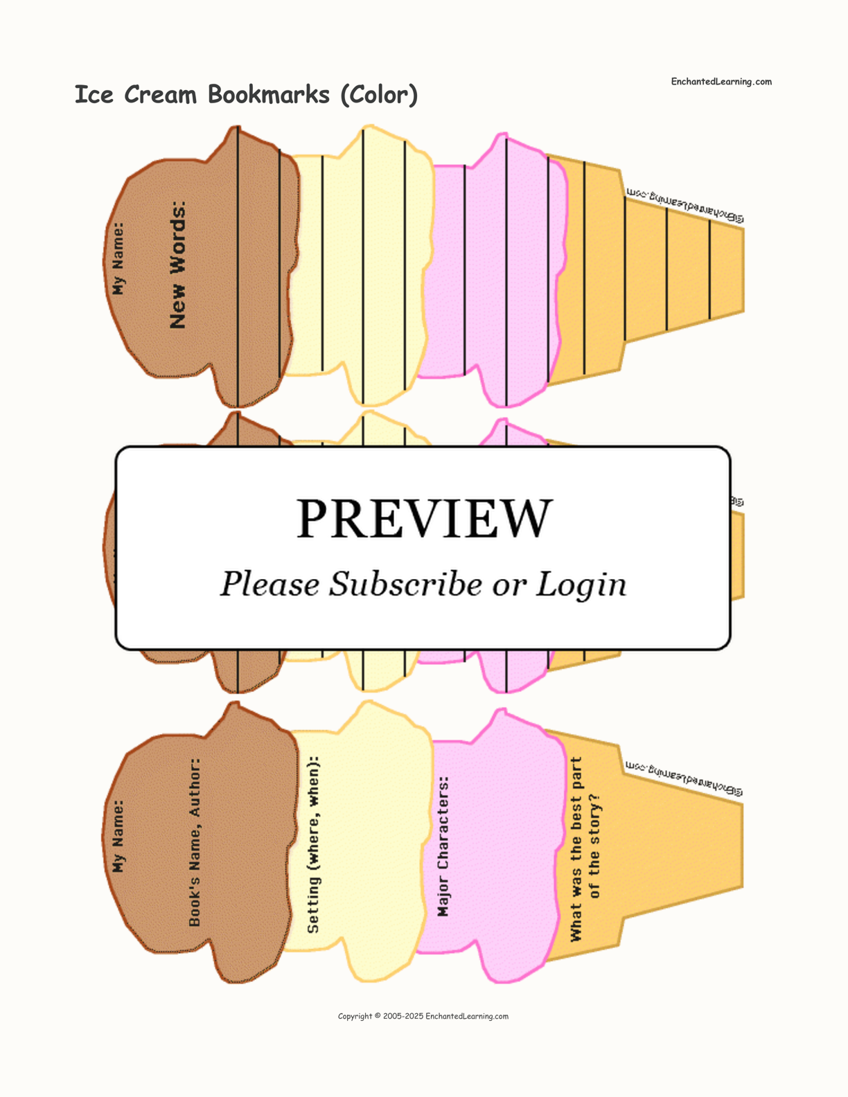 Print 3 ‘ice cream cone’ bookmarks. Write a mini book report, list books recently read, and list new words found in the book.