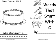 Words That Start With C A Printable Activity Book A short, printable book about simple words that start with C -- for early readers. The book has pages for the student to assemble, objects to color, and short phrases to copy (like "Cake starts with c."). The words include: cake, camel, can, car, card, carrot, castle, cat, cent, circle, cone, corn, cow, cube, cup, and cut. |