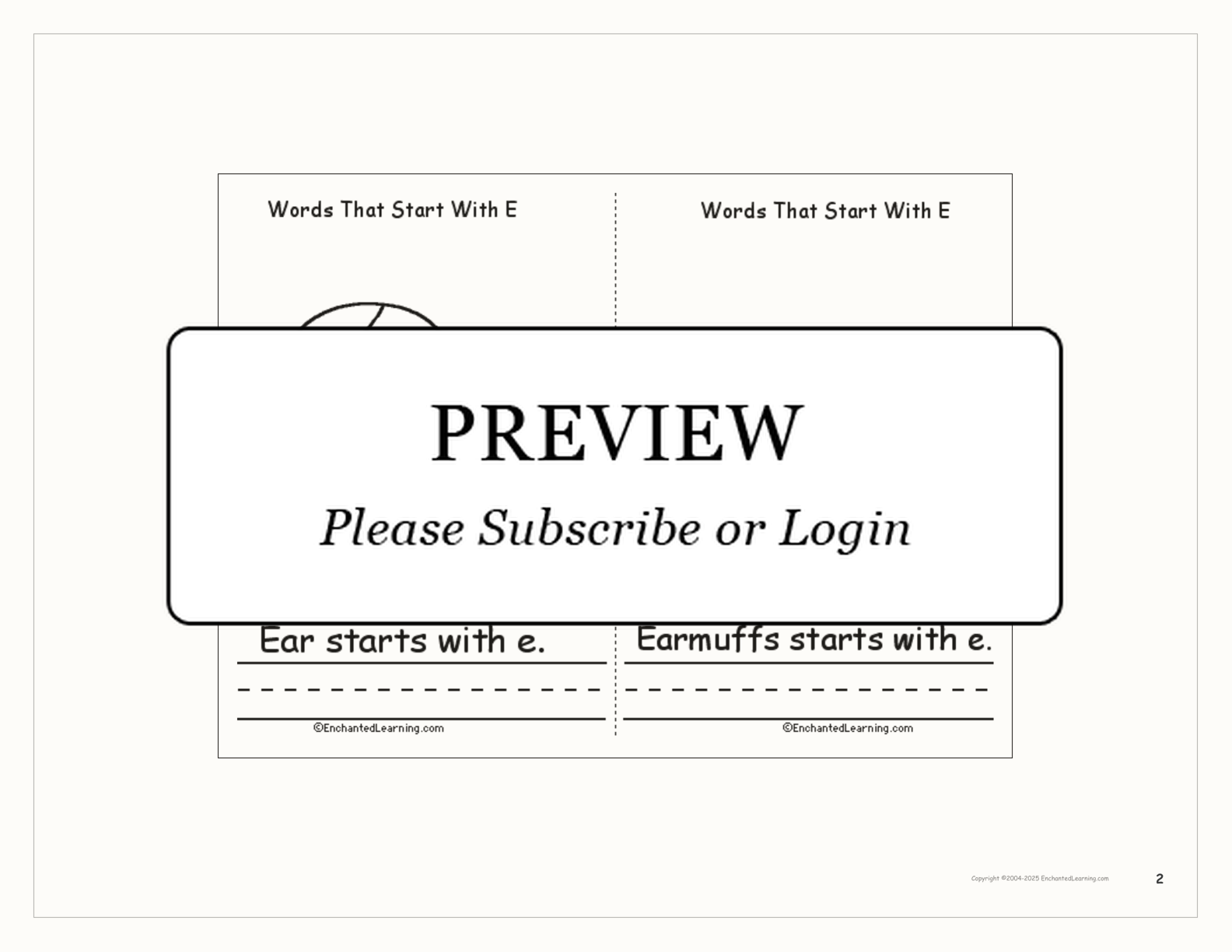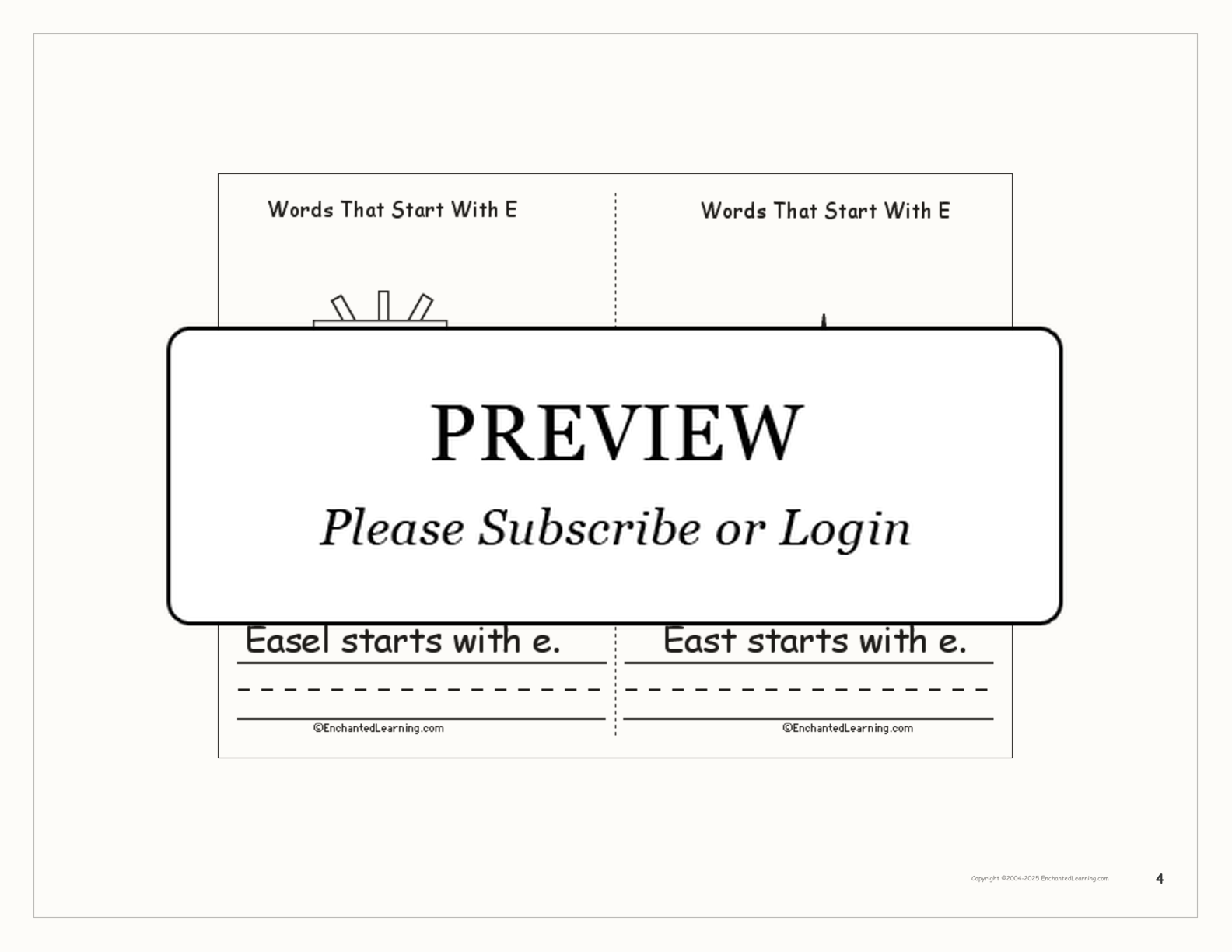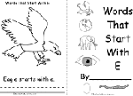 Print out the pages to make an early reader book, “Words That Start With E.” The book has pages for the student to assemble, objects to color, and short phrases to copy (like “Egg starts with e”).
