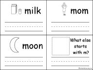 There are four rectangular book pages on each printed page. Have the students cut each page in four along the dark lines. Make sure the title page is on the top. The last page should be the one asking, "What else starts with m?" The order of the remaining pages doesn't matter. It you like, have the students put the words in alphabetical order or in order by word length.