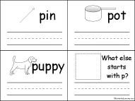 There are four rectangular book pages on each printed page. Have the students cut each page in four along the dark lines. Make sure the title page is on the top. The last page should be the one asking, "What else starts with p?" The order of the remaining pages doesn't matter. It you like, have the students put the words in alphabetical order or in order by word length.