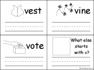 There are four rectangular book pages on each printed page. Have the students cut each page in four along the dark lines. Make sure the title page is on the top. The last page should be the one asking, "What else starts with v?" The order of the remaining pages doesn't matter. It you like, have the students put the words in alphabetical order or in order by word length.