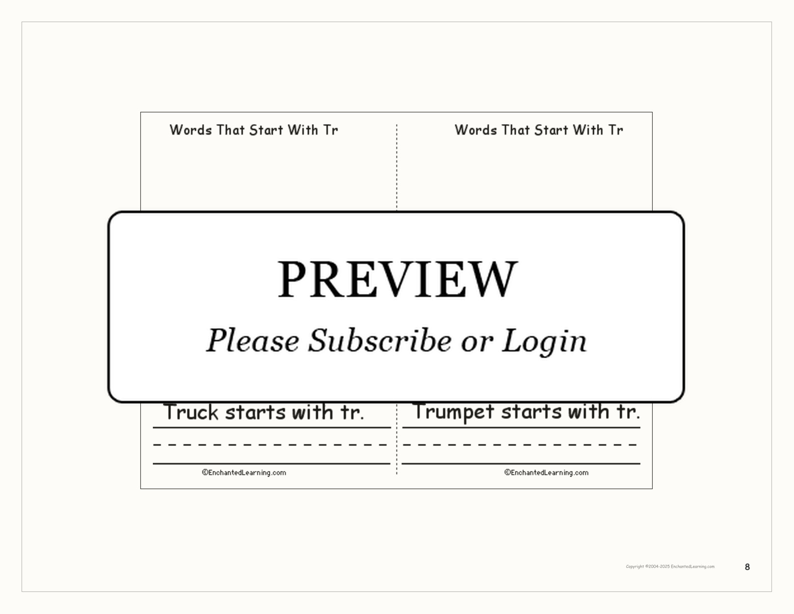 This is a short, printable book about simple words that start with tr – for early readers. The book has pages for the student to assemble, objects to color, and short phrases to copy (like “Tree starts with tr”).