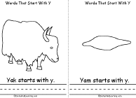 This is a short, printable book about simple words that start with Y – for early readers. The book has pages for the student to assemble, objects to color, and short phrases to copy (like “Yard starts with y”).