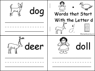 Words That Start With the Letter D A Printable Activity Book A tiny, printable book about simple words that start with D -- for early readers and writers. The book has 2 pages to print and makes 8 pages for the student to cut out, color, and write in. The words are: dog, deer, doll, door, dot, duck, and "What else starts with d? |