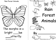 Rain Forest Animals Book A short book about rain forest animals to print (for early readers), with letters to fill in. There are pages on the morpho butterfly, toucan, anaconda, sloth, howler monkey, kinkajou, tarantula, piranha, capybara, poison arrow frog, and giant anteater. |